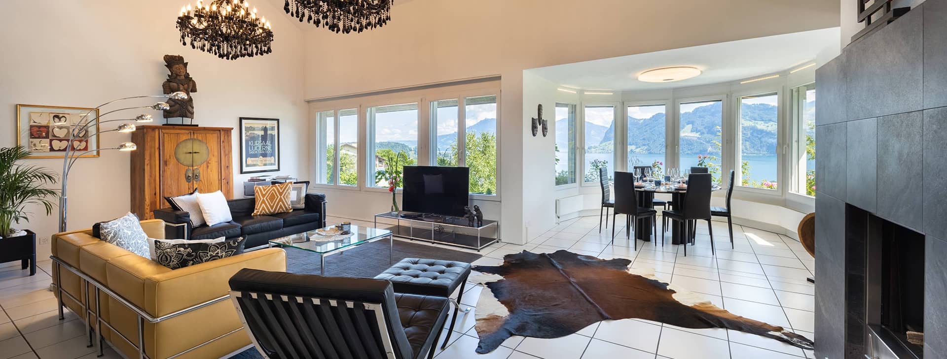 The nucleus of the luxury home villa is the very high vaulted ceiling in the open-plan living room, and the formal dining areas. The living area is extremely spacious and will never feel crowded even when fully occupied. There are 2 distinct formal dining areas that seat 6 guests each. Both dining areas have uninterrupted views of Lake Lucerne and its surrounding mountain ranges. The living room has ample seating in comfortable black and light brown leather chairs for cozy get-togethers. Facing the living room there is an open fireplace that will keep you cozy, happy, and warm during those winter holiday nights. The decoration is a mix of modern and antique furniture, supplemented by exquisite pieces of art and antiques, and magnificent black chandeliers hanging from the high ceilings.